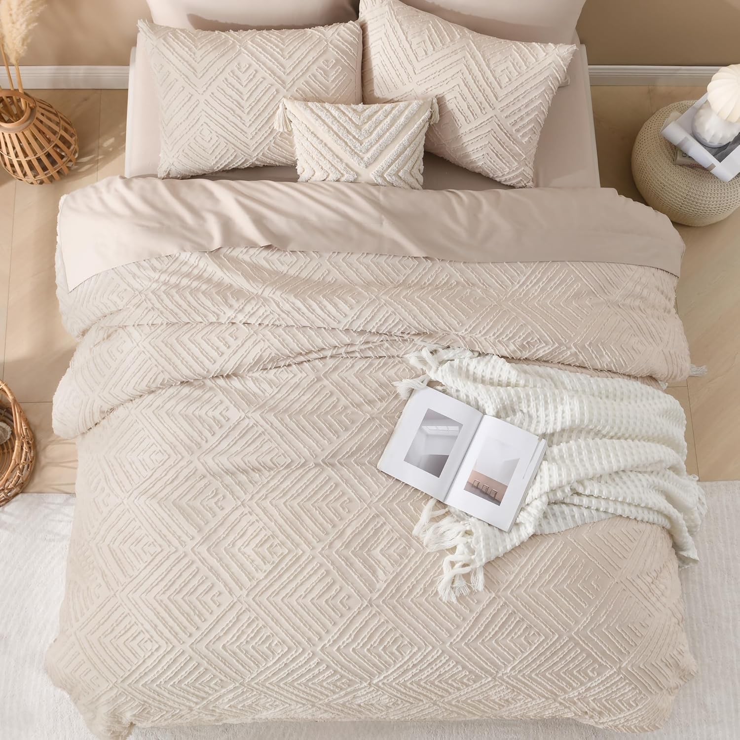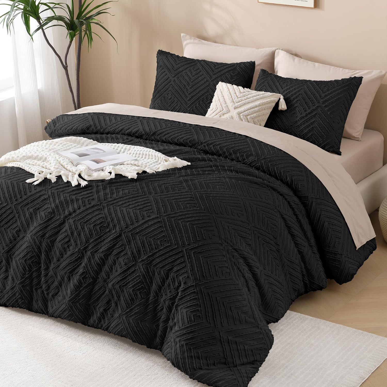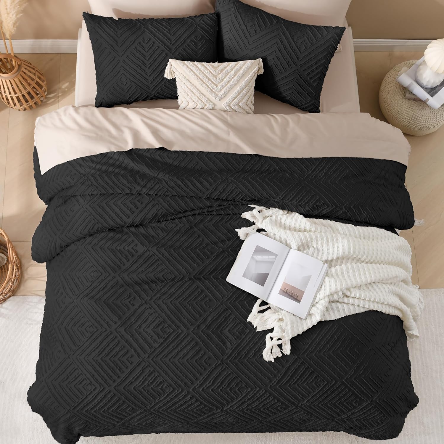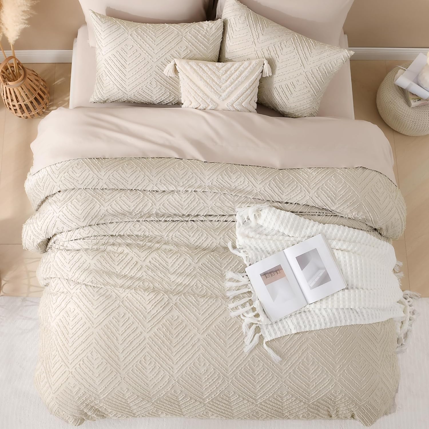 • 【Boho Design】Elegant embroidered tufts and crisp diamond lines will add a sophisticated touch to your space. This solid tone boho comforter is a flexible piece that will complement and integrate with your existing room decor.