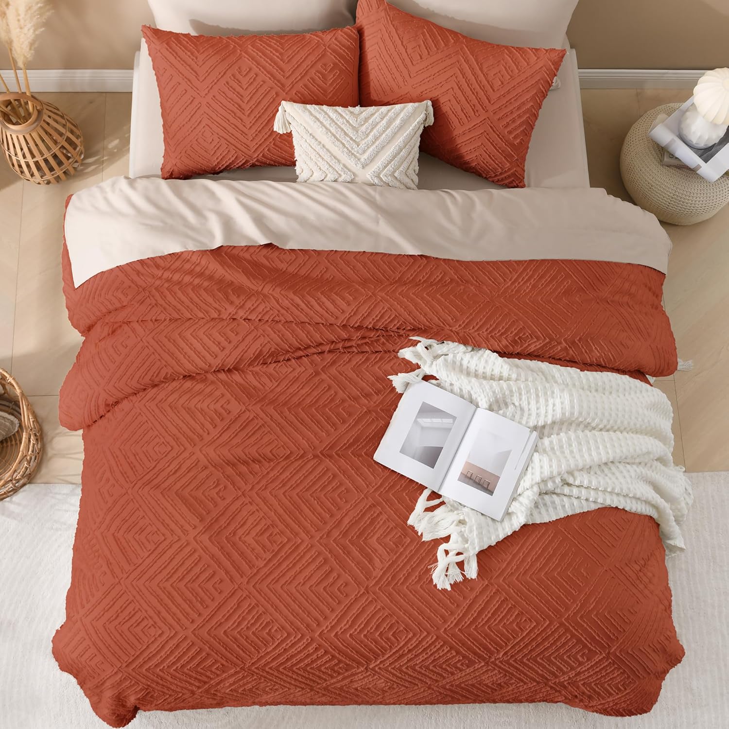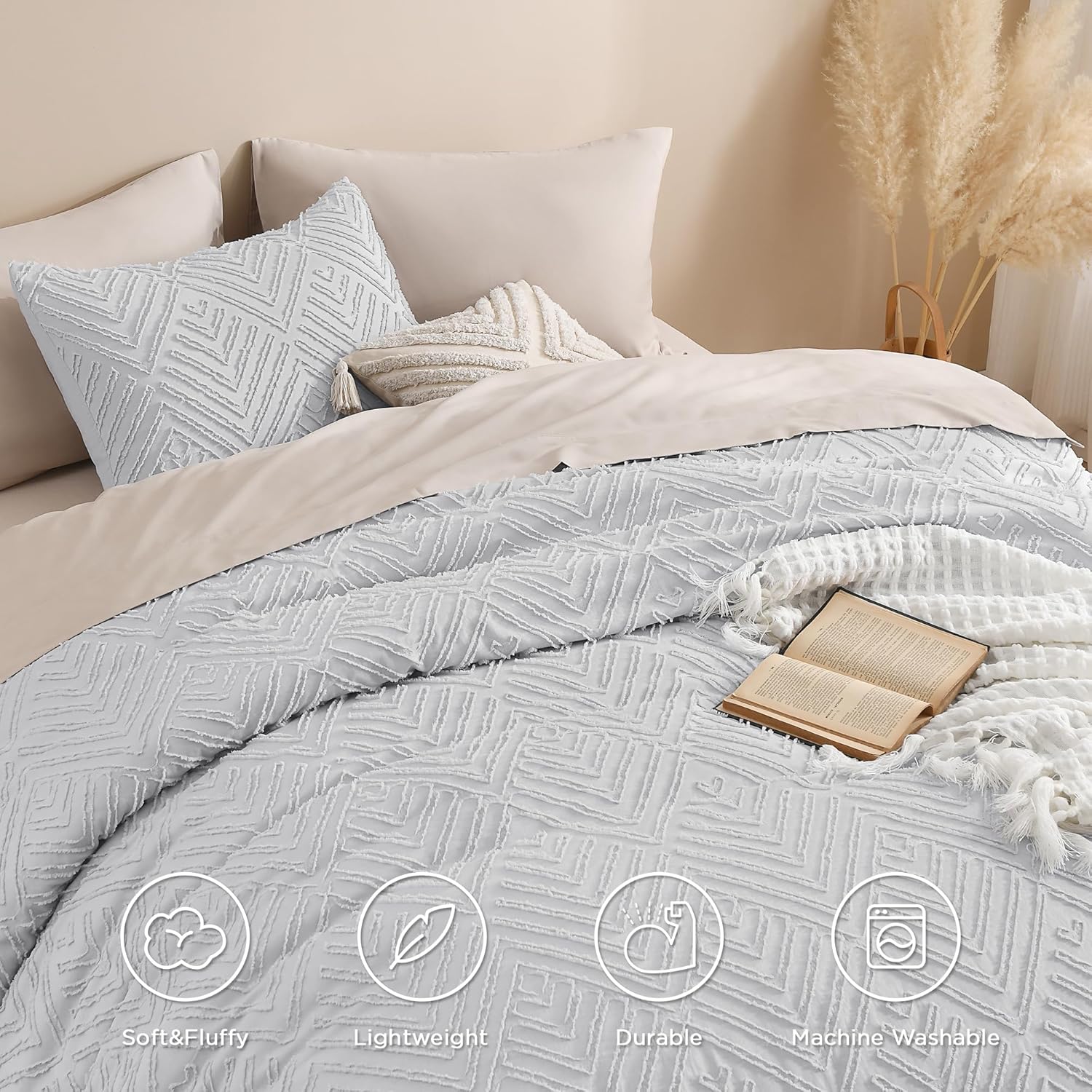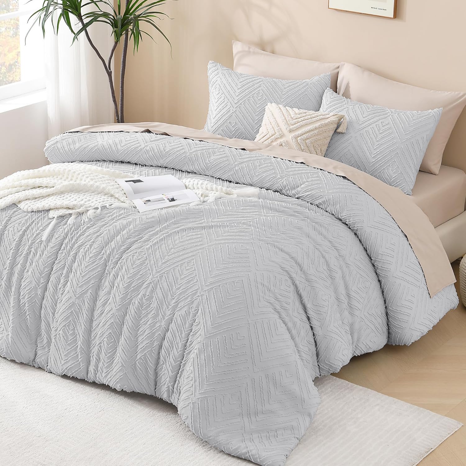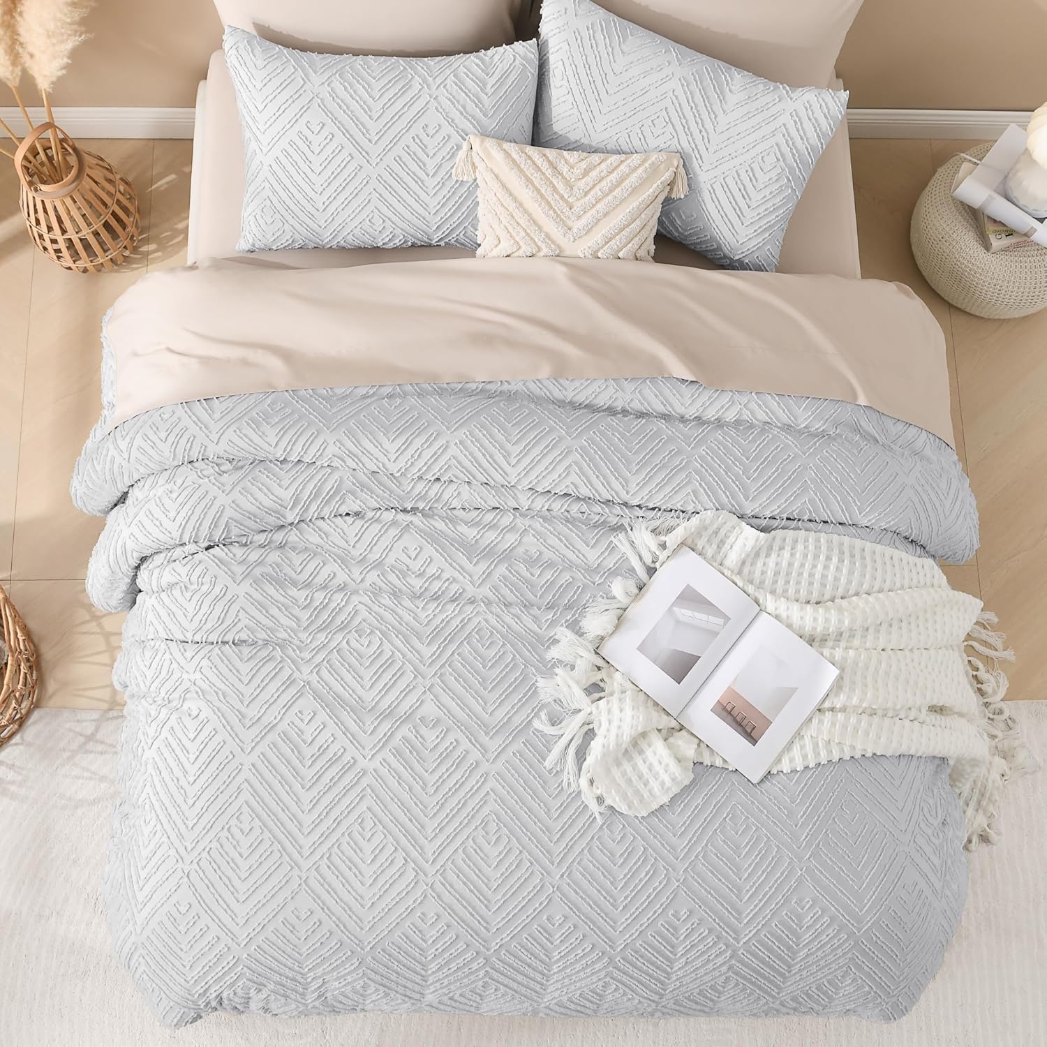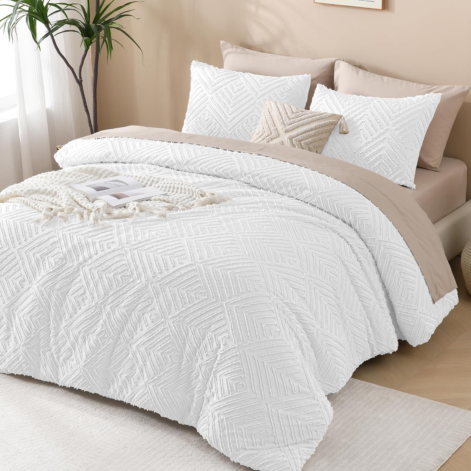 • 【Boho Design】Elegant embroidered tufts and crisp diamond lines will add a sophisticated touch to your space. This solid tone boho comforter is a flexible piece that will complement and integrate with your existing room decor.